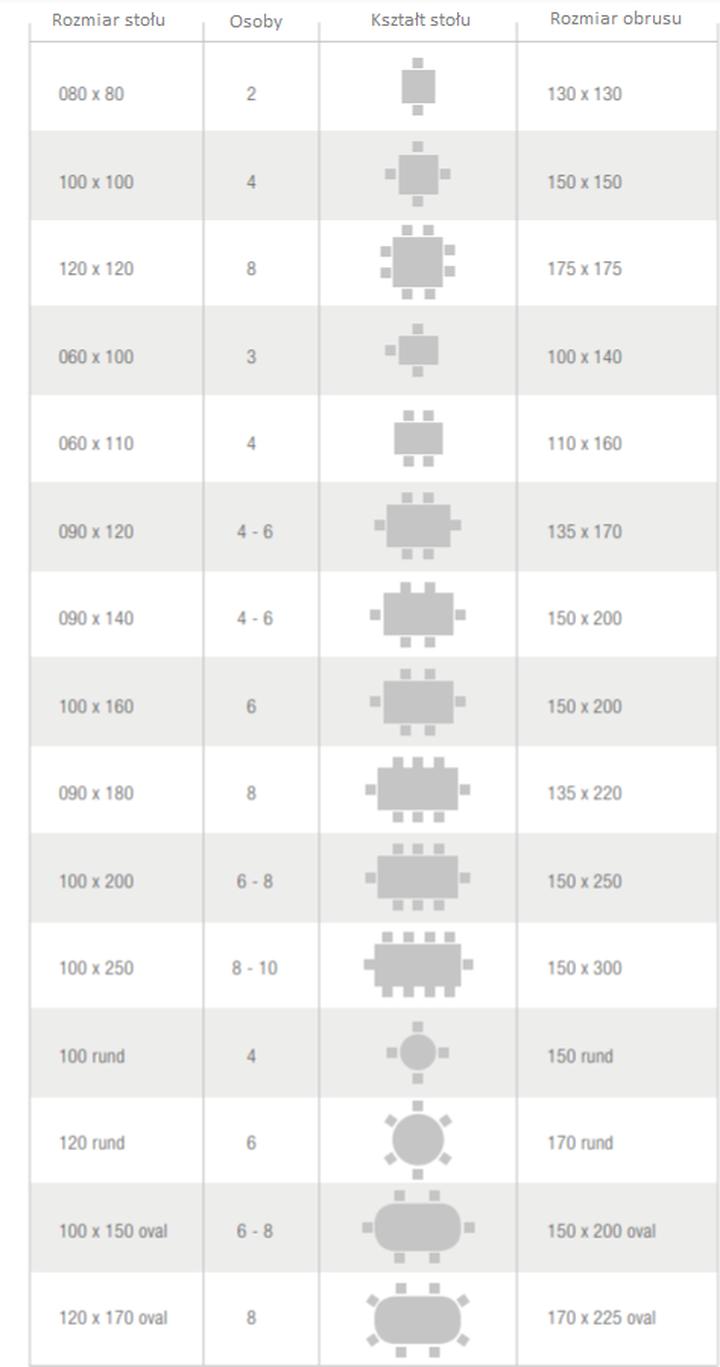 Rodzaj stołu Wymiary obrusu Dodatkowe informacje